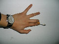 左手手腕一对银镯子。右手一块大黄色电子表,红绳。
